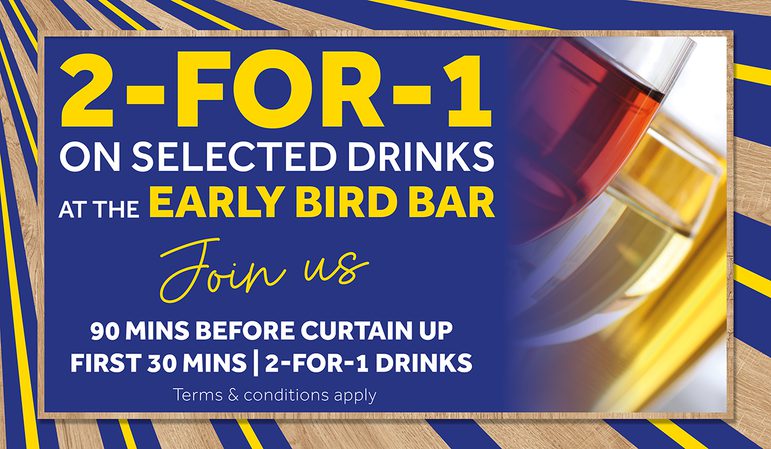 Enjoy 2-for-1 drinks in our Café Bar and Theatre Bar as part of our Early Bird Bar Offer until 8th March 2026!